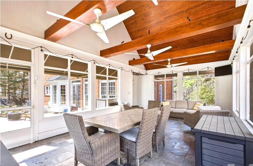 Off the great room, a large 20’x26′ enclosed porch opens out onto the pool area, serving as an outdoor living room. It features slate floors, a soaring wood ceiling, and four screened walls that let in the outdoors, and could easily be fully enclosed for three-season living.. The formal dining and living spaces flank each side of the two-story foyer, and a half bath and butler’s pantry complete the first level.